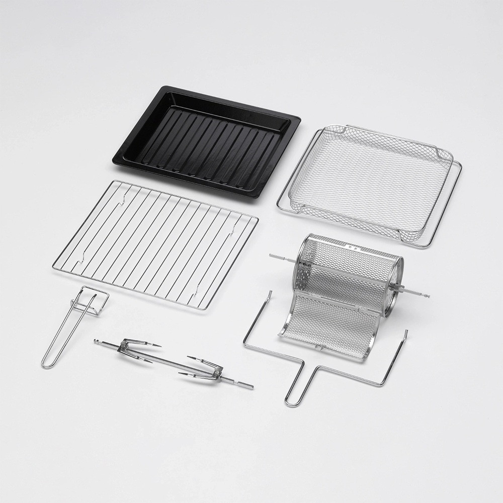 A készülék tartalmaz nagy frittierkosarat, grillrácsot, tepsit, forgónyársat, valamint két kihúzható segédeszközt – hogy az étel biztonságosan kezelhető legyen a magas hőmérsékleten belül is. A morzsatálca egyszerű tisztítást tesz lehetővé. A készülék elegáns, fekete dizájnnal készül, nagy ablakos ajtóval, amely modern megjelenést ad.