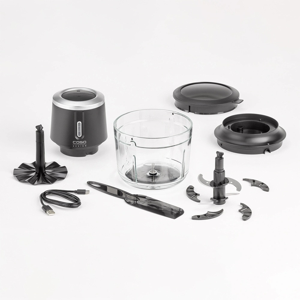 A CASO Chop & Go egy modern, vezeték nélküli aprító és turmixkészítő eszköz, amely a konyhában bárhol használható – nincs szükség kábelezésre. A készülék egy 1,0 literes üveg edénybe épített négy rozsdamentes acél penge segítségével gyorsan és hatékonyan aprít zöldségeket, gyümölcsöket, dióféléket, húst – vagy akár halat és magvakat is. A pengék mellett emulziós tárcsa is része a csomagnak, amely tökéletesen alkalmas mártások, öntetek, habok vagy krémek előállítására.