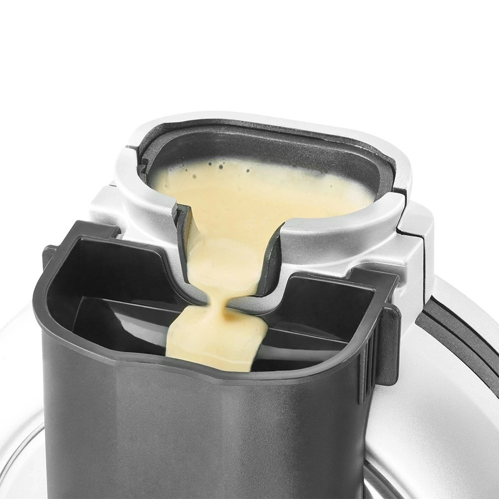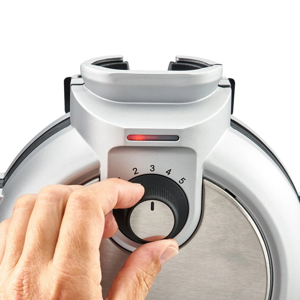 A készülék tetejéről tölthető be a tészta, így az eloszlása mindig egyenletes, és a felesleg elcsöpög – nem ragad a gép belső felületéhez. A felesleges tészta automatikus gyűjtőedénybe kerül, hogy tisztán és praktikus módon dolgozhasson tovább. Az öt állítható fokozatú grillkerek szabályzó lehetővé teszi a kívánt barna árnyalat beállítását – a világostól a ropogós aranyig. Amikor a gofri elkészül, világító jelzés vált át zöld fényre, és hangjelzés jelzi a véget.