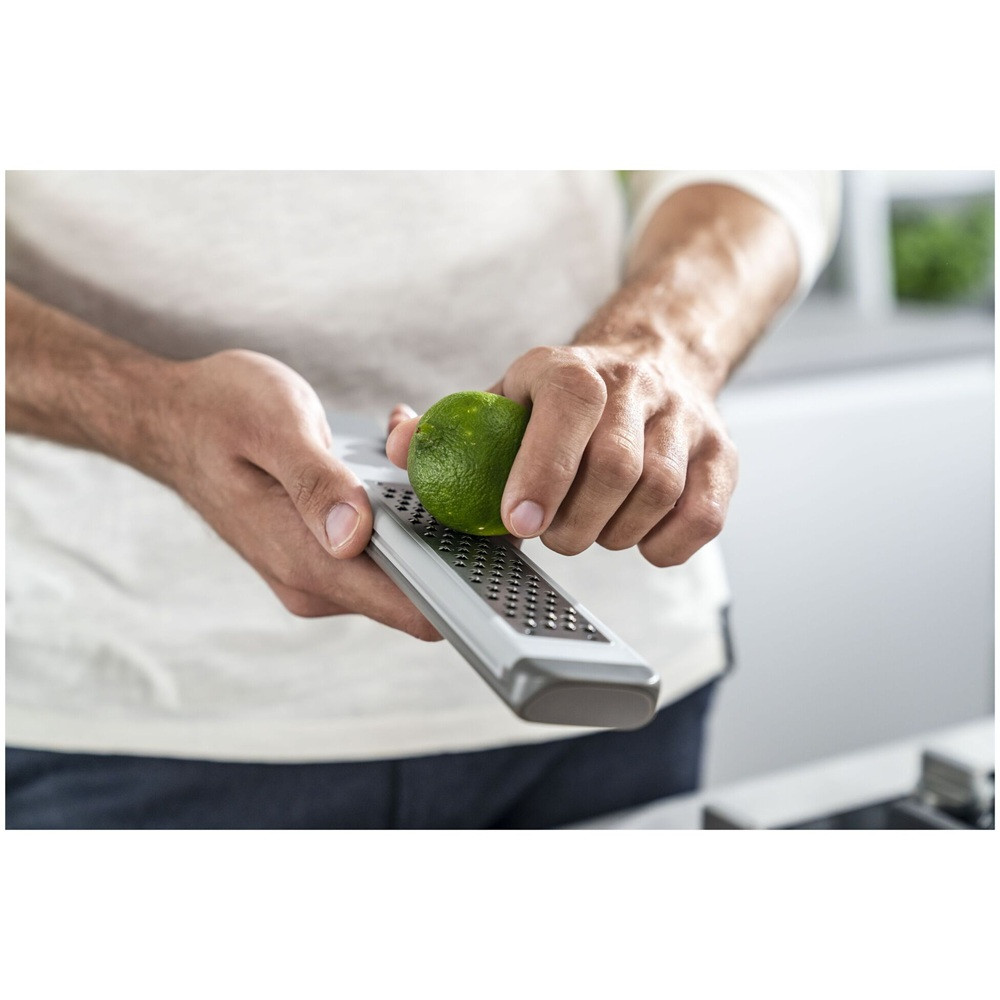 Az eszköz ergonomikus kialakítása és csúszásmentes talpa biztosítja a stabil tartást, a kiváló minőségű anyagok pedig hosszú élettartamot és higiénikus tisztíthatóságot garantálnak – a reszelő mosogatógépben is mosható. A modern, letisztult dizájnt a neves milánói formatervező páros, Matteo Thun és Antonio Rodriguez jegyzi.